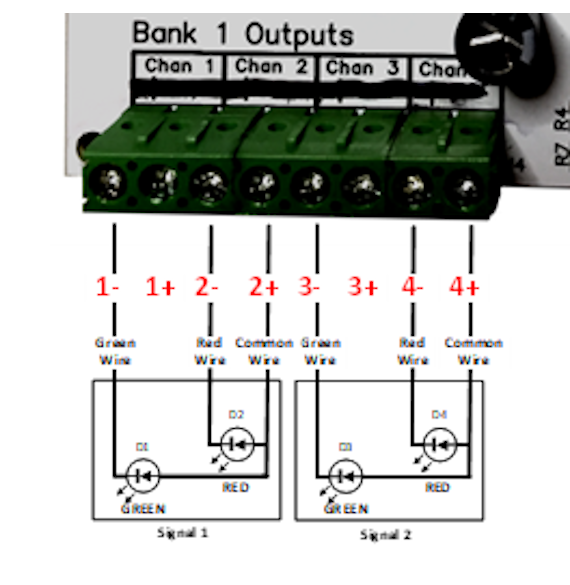 Eight pairs of screw terminal outputs to connect to LEDs, incandescent lamps or other devices, positive side common.