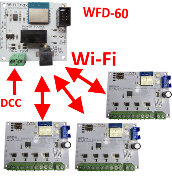 But to make best use of one or more WFS-42, you'll need a Wifitrax WFD-60 Wi-Fi and DCC Gateway. This device discovers and controls a set of
